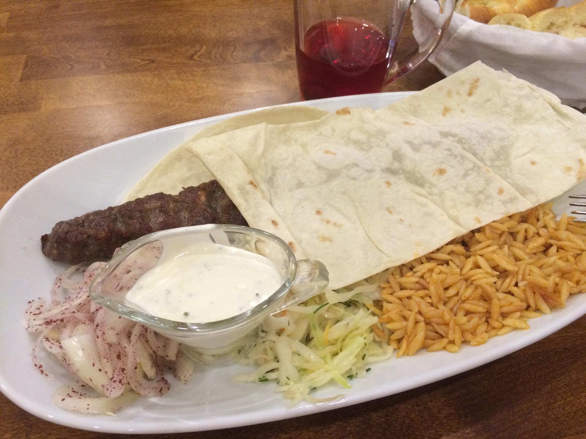 очень и очень вкусный кебаб из баранины, подается с капустным салатом, пшеницей, луком и лавашом.Одной порции хватит на двоих с головой
